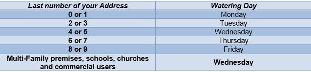 Landscaping Watering (using automatic or manual irrigation systems) is permitted only once EVERY OTHER week between hours 7:00 a.m. and 11:00 a.m. and 7:00 p.m. to 11:00 p.m. The last number of your address determines what day you are able to water. It is a non-watering week, this week, the week of September 29th and you may water once during the week of October 6th.